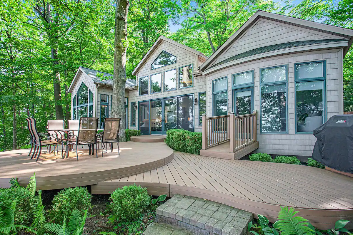 “We loved our stay! The home and property is absolutely gorgeous, and wonderful for a family trip. There are multiple beautiful and functional indoor and outdoor entertaining and play areas. It was also great that they had lounge chairs, umbrellas and toys for the beach and so many towels! Our family loved breakfasts on the deck with breathtaking views of Lake Michigan, ping pong tournaments, board games, hanging out on the beach, and a short and easy walk back to the house to replenish snacks or to rest in the shade for a bit. We will DEFINITELY visit again in the future!”