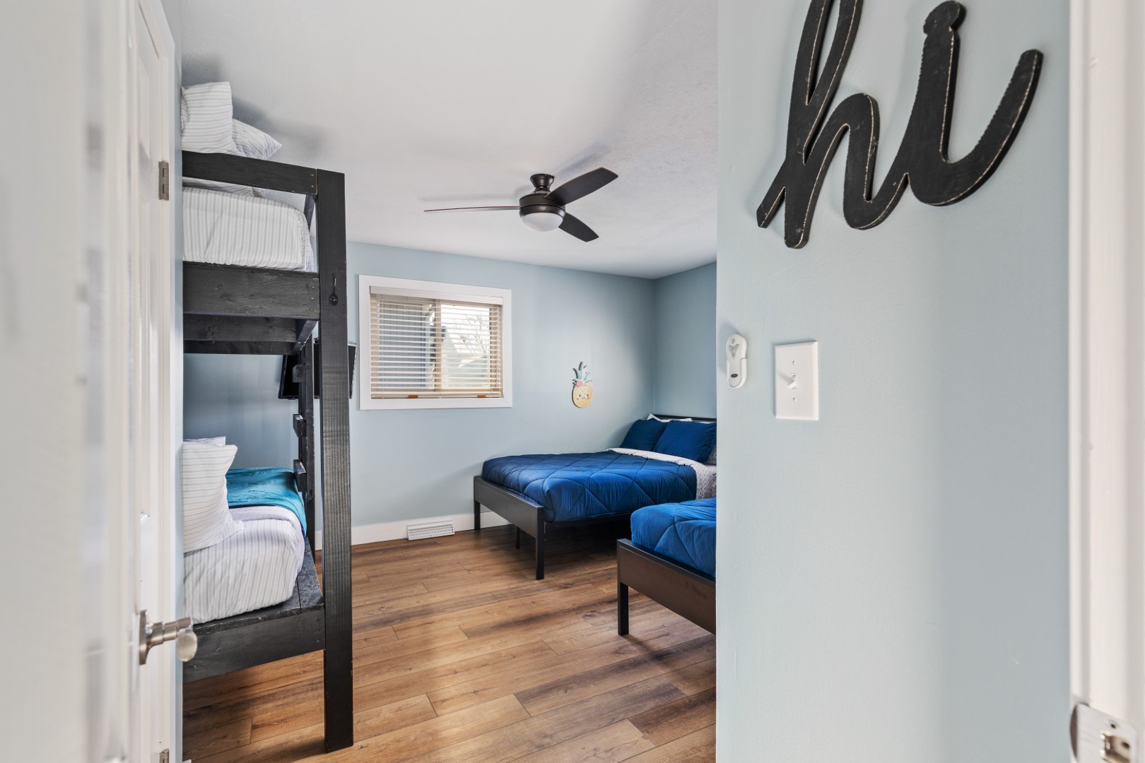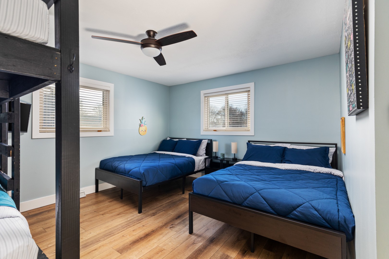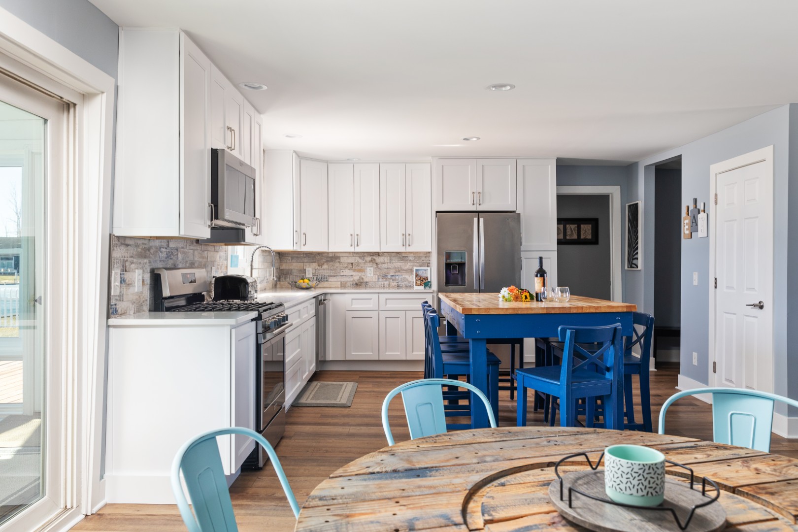 From the moment you step inside, the house feels light and open, filled with lake views that seem to follow you from room to room. The sunroom quickly becomes everyone’s favorite spot, a cozy, light-filled haven where mornings begin with coffee by the fire and evenings fade into stillness as the last light dances on the water. Each bedroom is thoughtfully designed for rest and togetherness, with soft beds, warm touches, and enough room for everyone to unwind. The kitchen hums with conversation and the scent of something delicious, perfectly equipped for shared meals that spill out onto the deck or down to the sand.