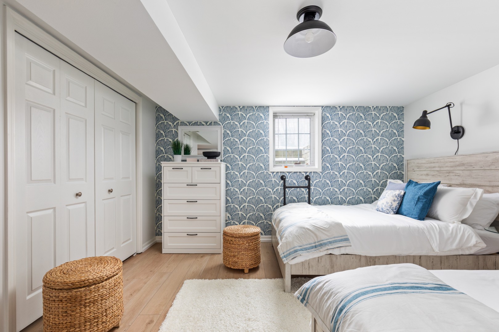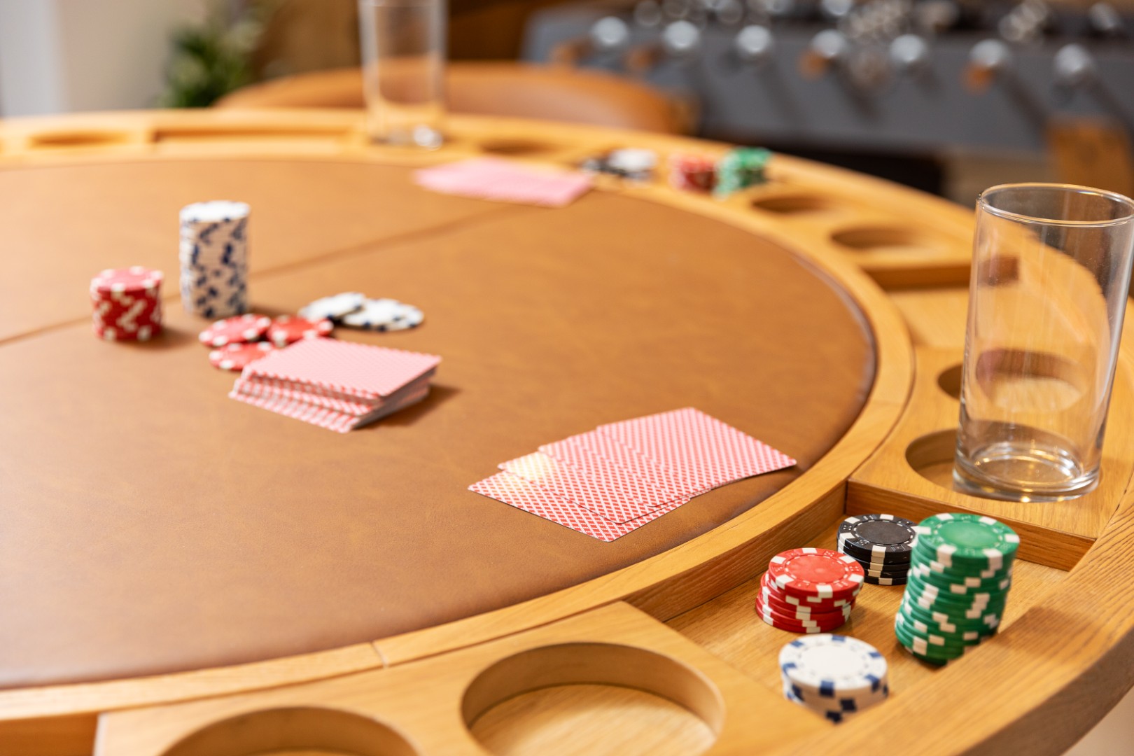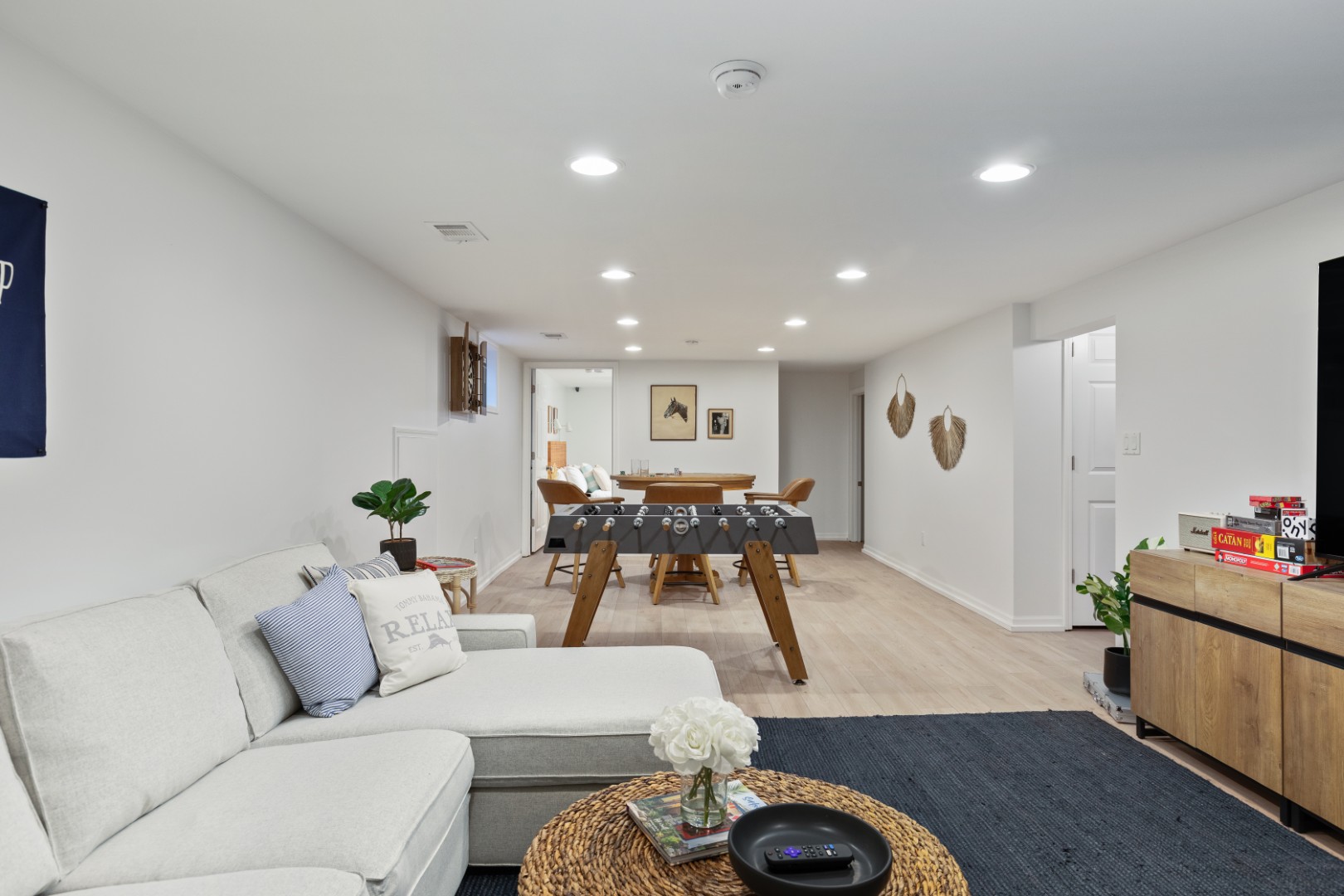 Inside, the home feels both polished and playful. The kitchen hums with the sound of coffee brewing and conversation starting early, while nearby, the living space invites board games, music, and easy relaxation. Each bedroom is a pocket of calm—simple, restful, and thoughtfully styled for comfort. Downstairs, the energy shifts toward fun with a poker table, foosball, and the soft glow of a screen waiting for movie nights or impromptu tournaments.