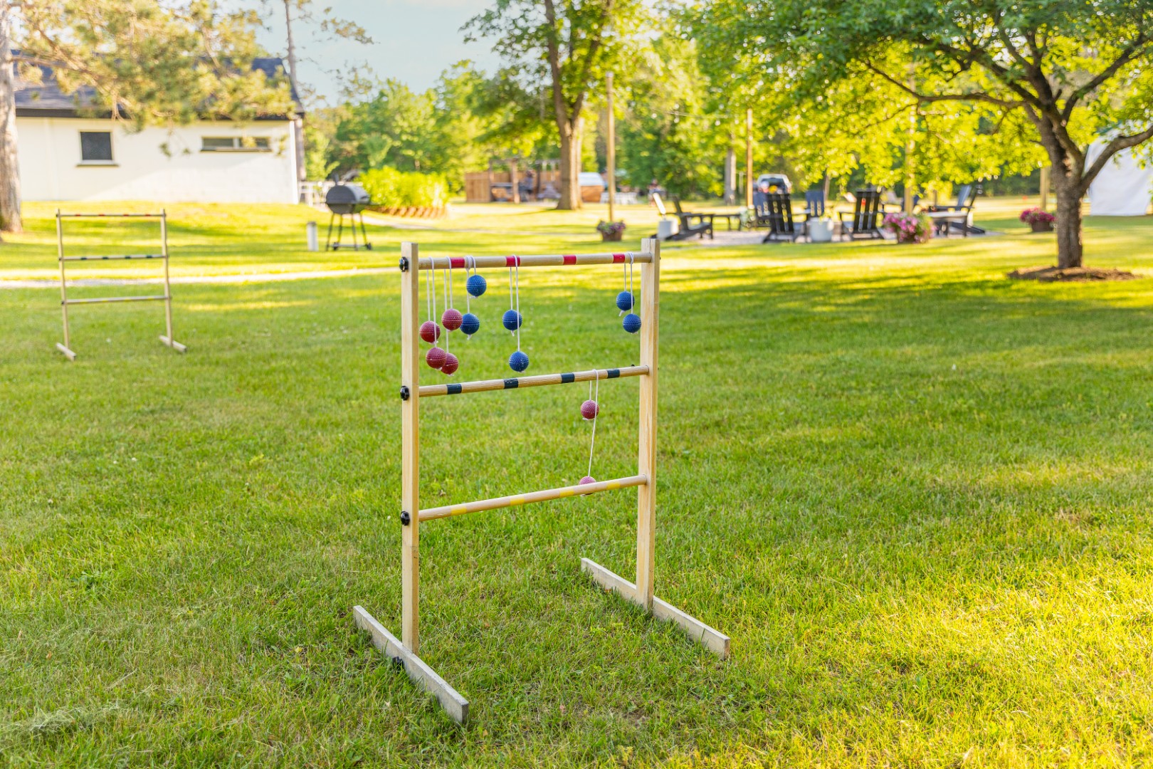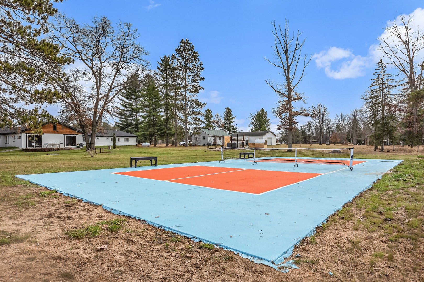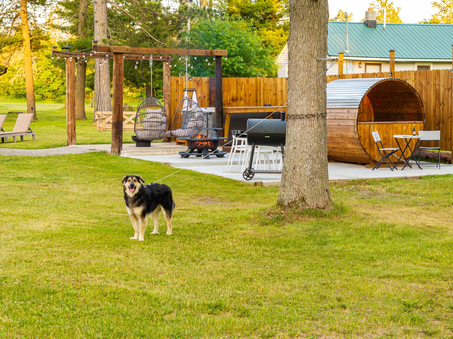 Outside, the spirit of the north takes over. A gentle trail of pine needles leads toward the sauna and hot tub, where the air hums with the scent of cedar and steam. The fire pit glows as night falls, laughter and the crackle of wood carrying softly across the trees. In the daylight, pickleball matches play out nearby, and the sounds of paddles and laughter mix with birdsong.