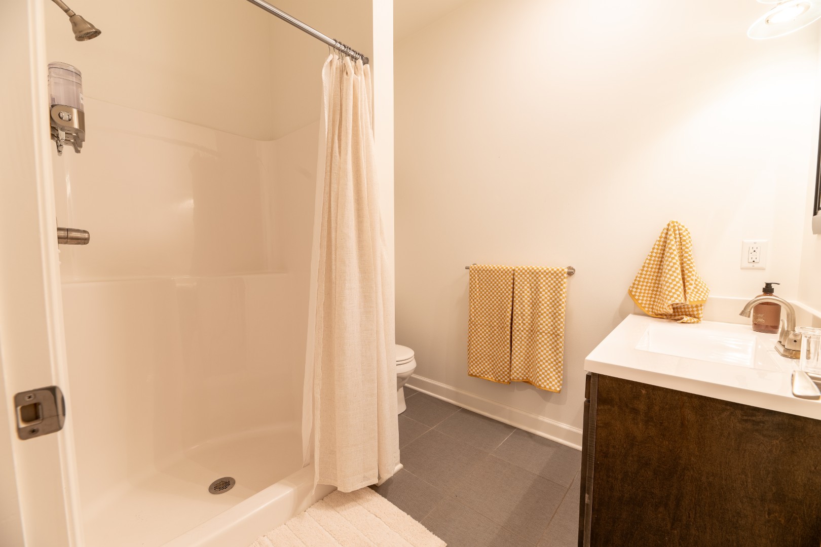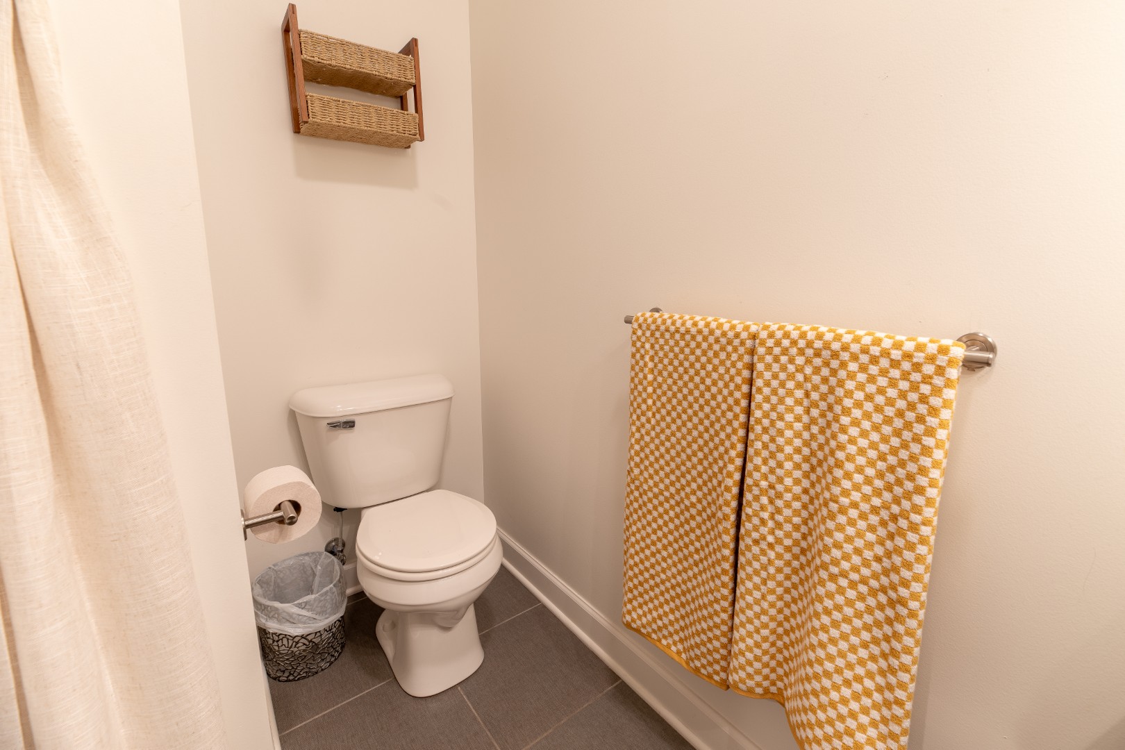 The bedroom feels intimate and calm, with a plush queen bed and thoughtful details that make rest come easy. A modern bathroom, stocked with soft towels and simple comforts, completes the space. For families or friends traveling together, a sleeper sofa in the living room offers extra flexibility without sacrificing the condo’s airy feel.