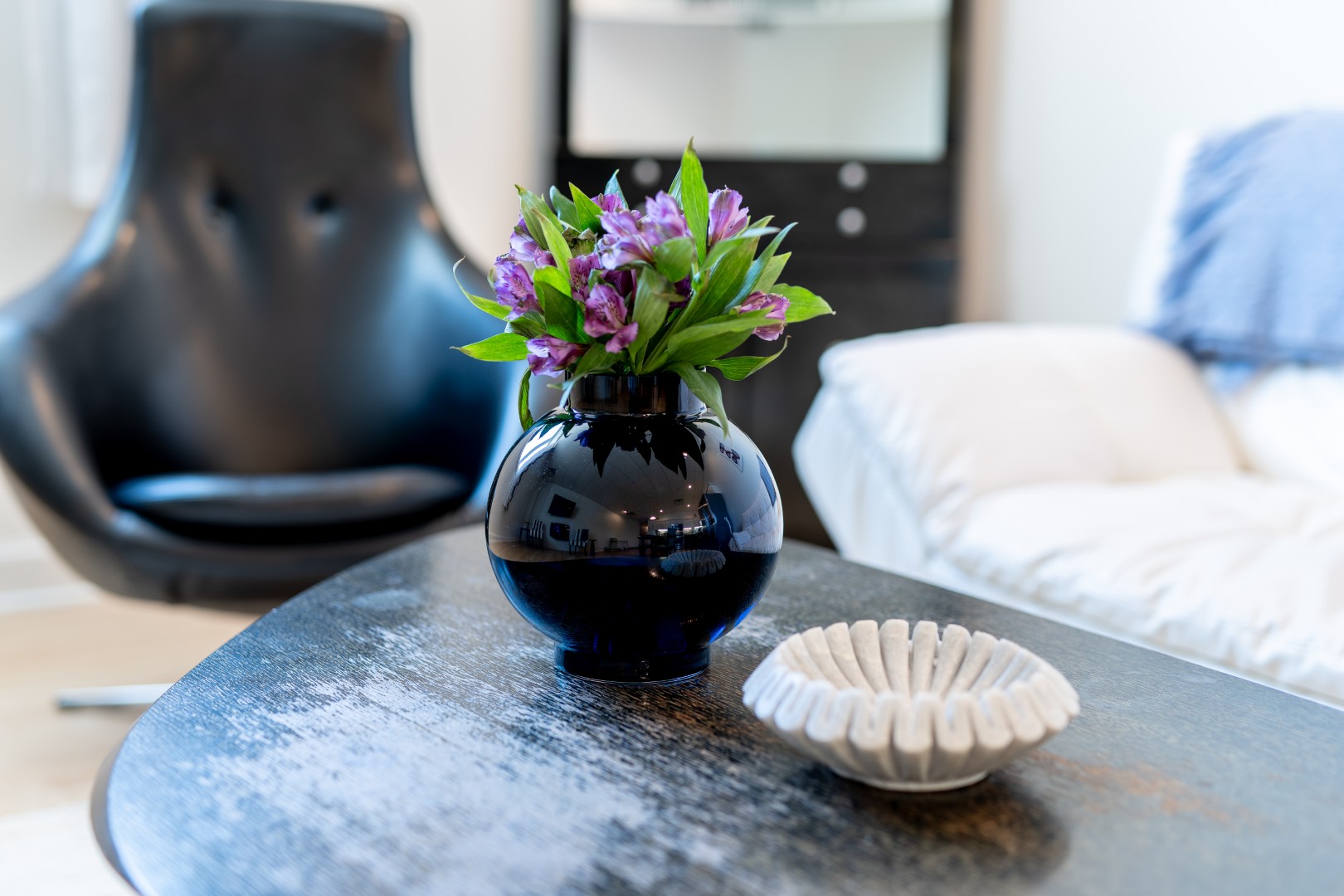 Inside, the atmosphere feels both fresh and welcoming. The open-concept living area glows with natural light, blending soft textures and clean lines for a space that feels instantly relaxing. The kitchen, sleek and fully equipped, makes every meal feel effortless—whether it’s a quiet breakfast before a beach walk or a shared dinner after a day exploring the shoreline. Gather at the table for wine and conversation as the last light of the day filters through the windows.